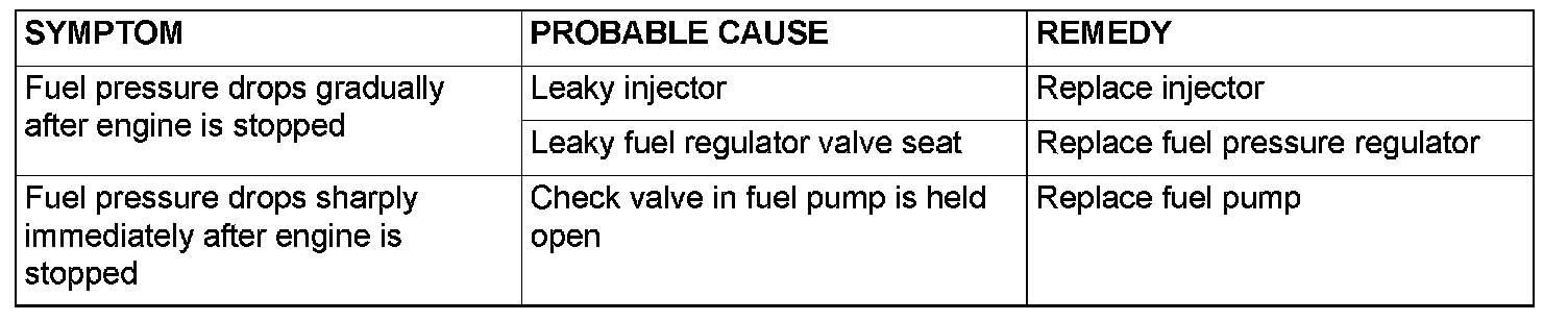 13. Stop the engine and observe fuel pressure gauge reading. It is normal if the reading does not drop within two minutes. If it does, observe the rate of drop and troubleshoot and repair according to the table. Start, then stop the engine.