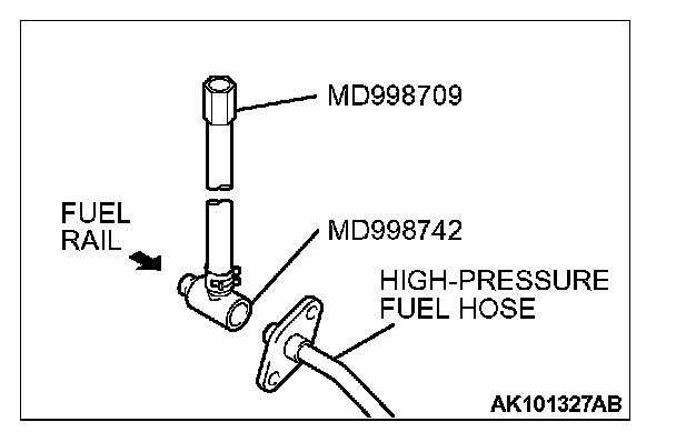 15. Remove the fuel pressure gauge or special tool MB991637, and special tools MD998709 and MD998742 from the fuel rail.