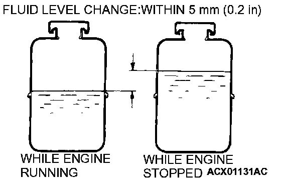 3. Check the fluid in the oil reservoir for foaming or milkiness. Check the difference of the fluid level when the engine is stopped, and while it is running. If the change of the fluid level is 5 mm (0.2 inch) or more, air bleeding should be done.