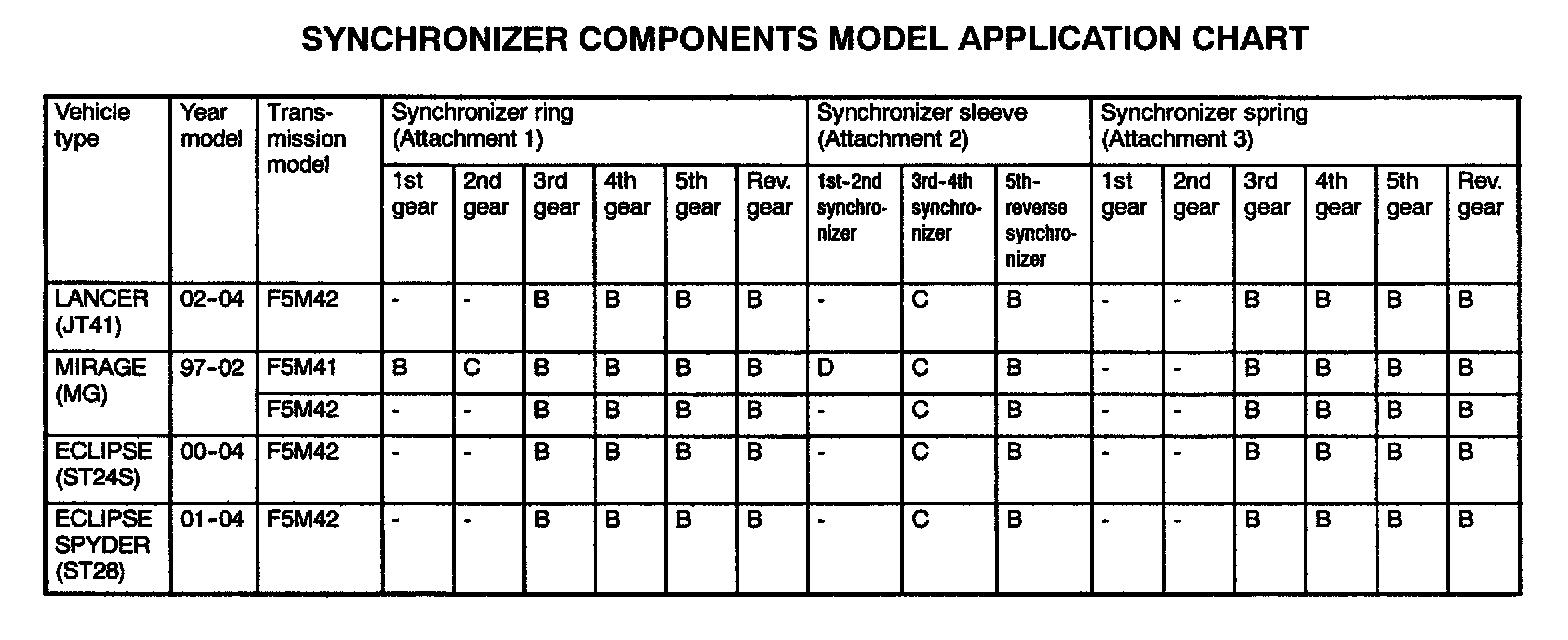 Refer to Attachments 1 through 3 and the synchronizer components application chart.