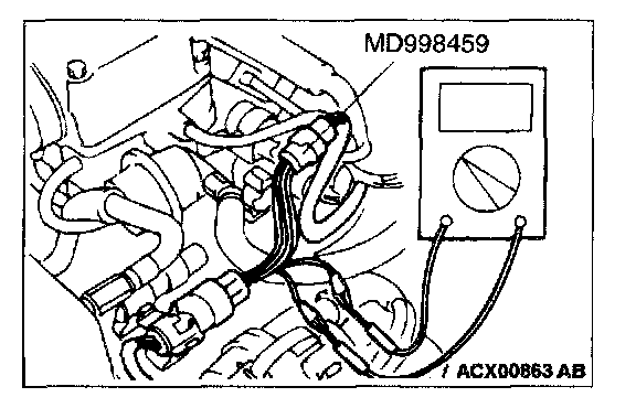Be sure to use special tool, MD998459. Never insert a test probe from the harness side, as this will reduce the waterproof performance and result in corrosion.