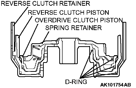 1. Install D-rings in the grooves on the reverse clutch retainer, piston, overdrive clutch piston and spring retainer. Be careful not to twist or damage the D-rings.