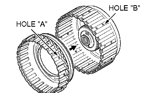 Align the outer circumference holes ("A" and "B") of the reverse clutch piston and the reverse clutch retainer to assemble them.