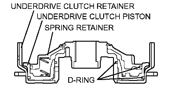 1. Install a D-ring in the groove in the underdrive clutch retainer and piston, and in the groove in the outside of the spring retainer. Be careful not to twist or damage the D-rings.