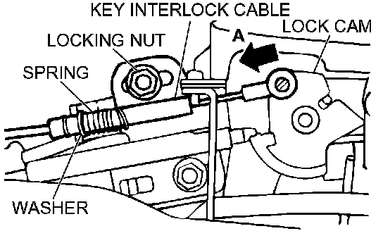 4. Lightly push the key interlock cable into the key interlock cable housing toward the arrow (A) direction until the cable movement stops and the cable end eye is aligned with the shaft on the lock cam. Tighten the lock nut. Snap the cable end eye onto the shaft of the lock cam.