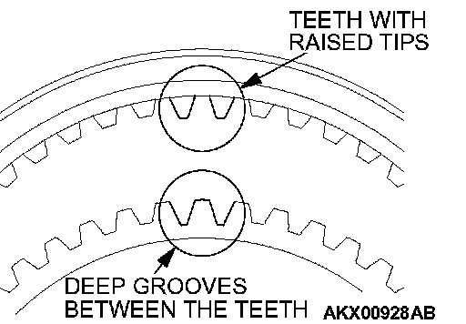 2. Install the synchronizer sleeve so that the areas with teeth that have raised tips (three areas total) are aligned with the areas on the synchronizer hub that have deep grooves between the teeth (three areas total).