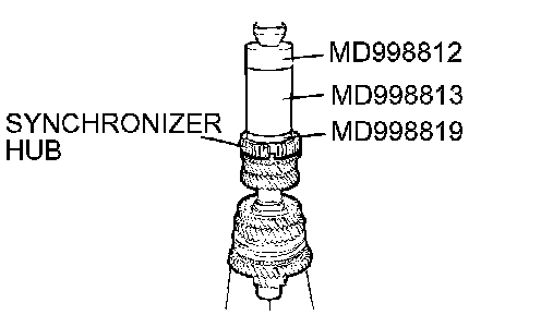 Using special tools MD998812, MD998813, MD998819, install the 5th speed gear sleeve onto the output shaft with the press.