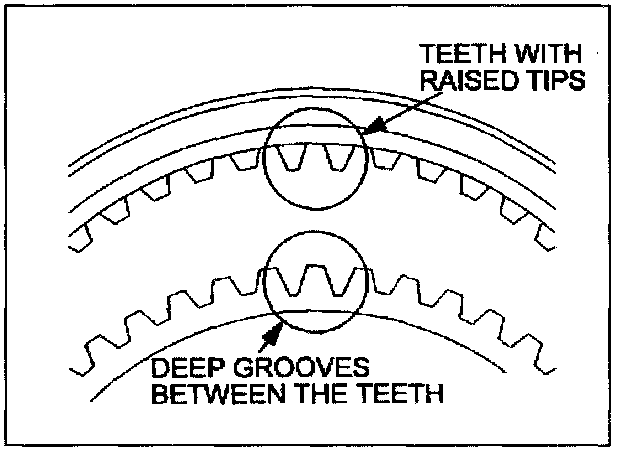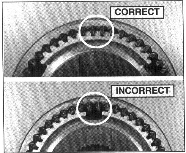 DO NOT position the synchronizer hub with the synchronizer sleeve's three sets of longer teeth in the detent gaps of the synchronizer hub. The sleeve's longer teeth with the raised tips must be positioned into the deeper grooves in the hub. Otherwise, the transmission will not shift properly.