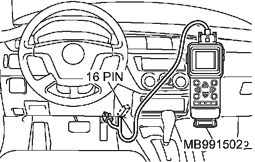 CAUTION: To prevent damage to scan tool M B991502, always turn the ignition switch to the "LOCK" (OFF) position before connecting or disconnecting scan tool MB991502.
