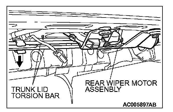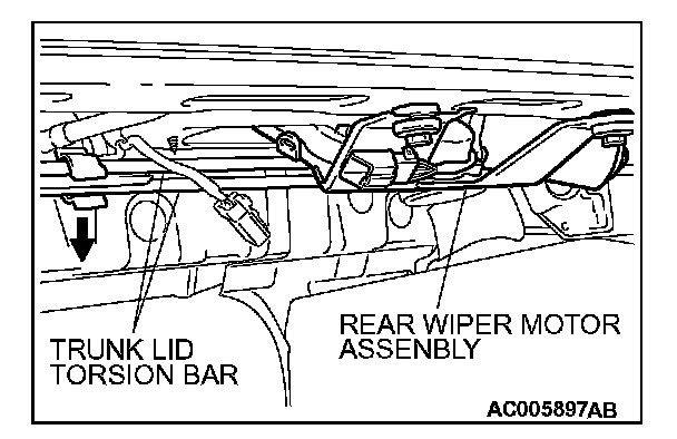Close the trunk lid slightly and lower the trunk lid torsion bar slightly when removing the rear wiper motor assembly. If you fail to do this, the rear wiper motor assembly will interfere with the trunk lid torsion bar.