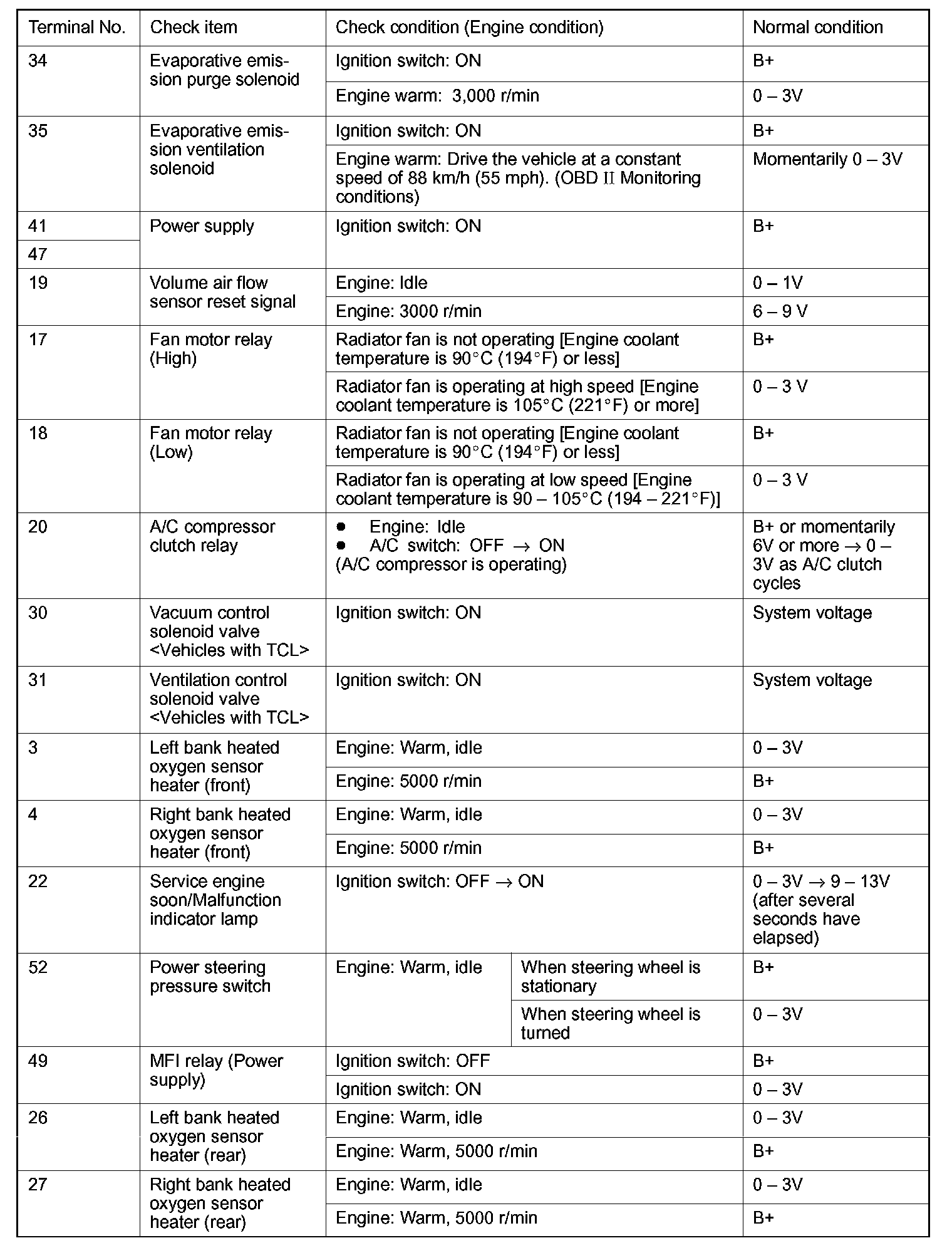 CHECK AT THE POWERTRAIN CONTROL MODULE (PCM)TERMINAL VOLTAGE CHECK CHART