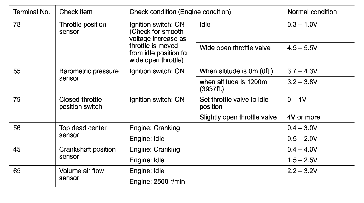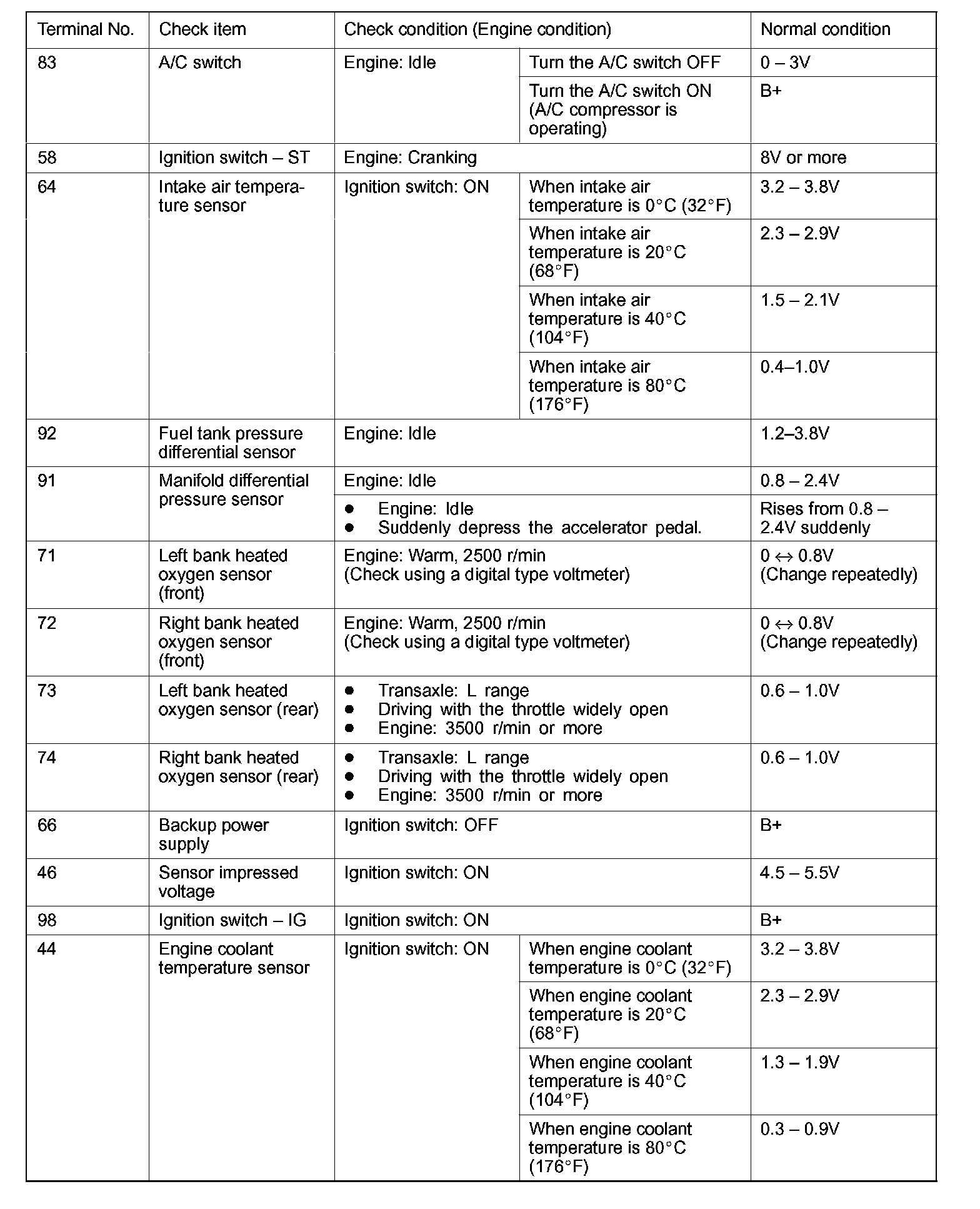 3. If voltmeter shows any division from standard value, check the corresponding sensor, actuator and related electrical wiring, then repair or replace.
