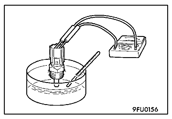 2. With temperature sensing portion of engine coolant temperature sensor immersed in hot water, check resistance.