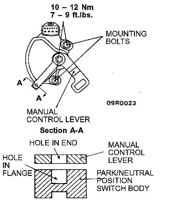 4. Loosen the park/neutral position switch body mounting bolts and turn the park/neutral position switch body so the hole in the end of the manual control lever and the hole (cross section A-A in the figure on the left) in the flange of the park/neutral position switch body flange are aligned.