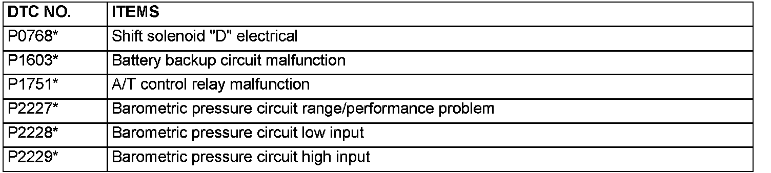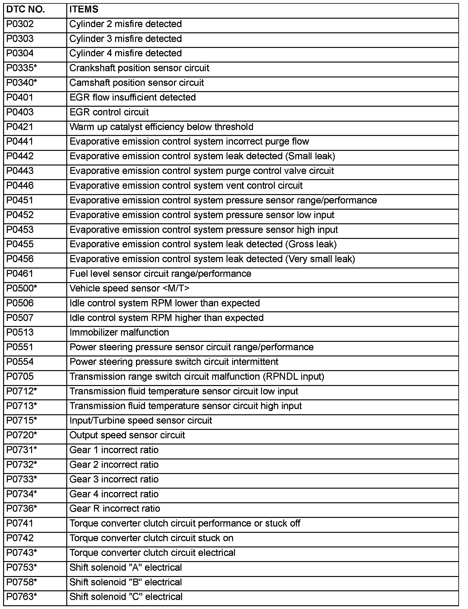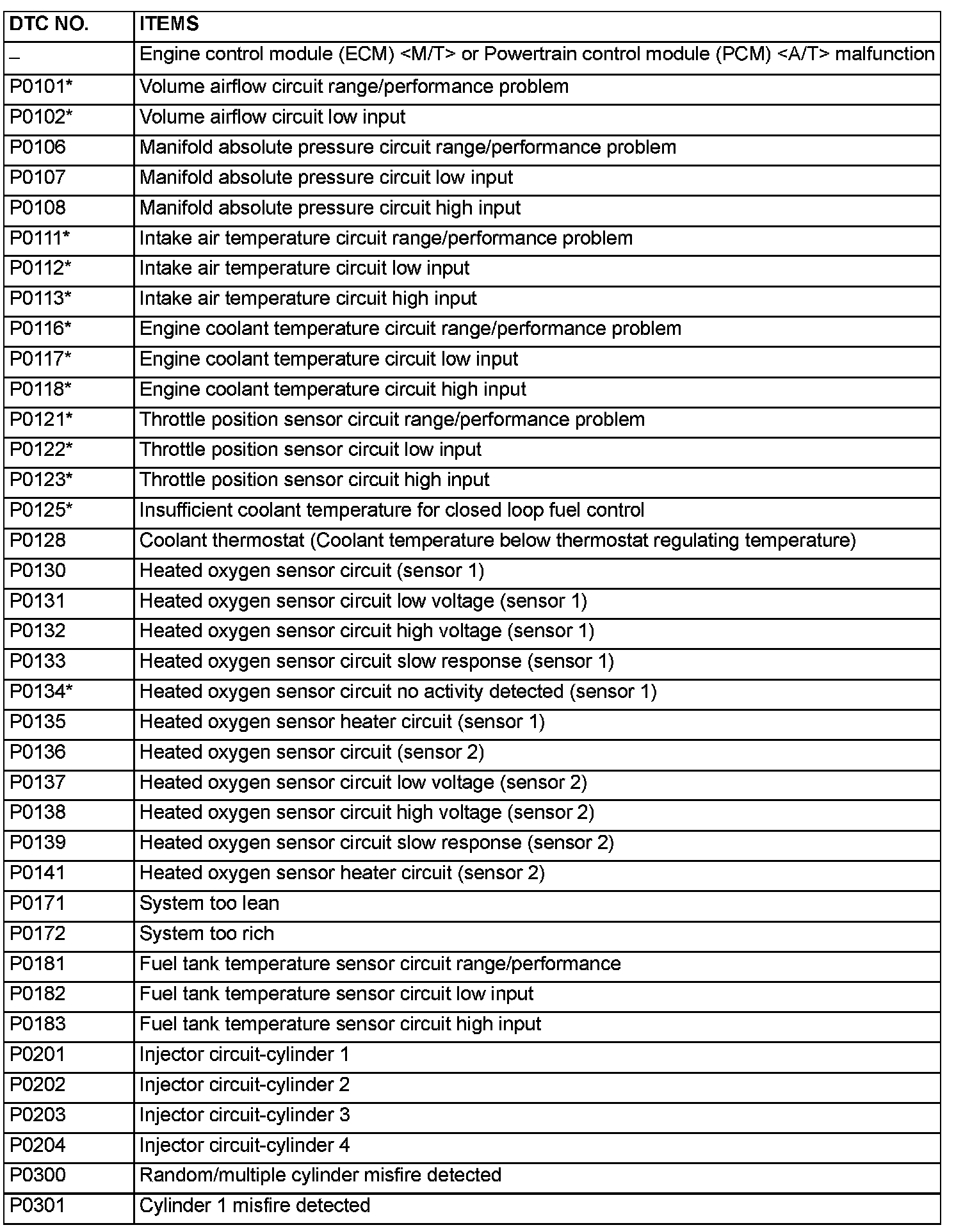NOTE: After the ECM [M/T] or PCM [A/T] has detected a malfunction, the Malfunction Indicator Lamp (SERVICE ENGINE SOON or Check Engine Lamp) illuminates when the engine is next turned on and the same malfunction is re-detected. However, for items marked with a "*" in the DTC NO column, the Malfunction Indicator Lamp (SERVICE ENGINE SOON or Check Engine Lamp) illuminates on the first detection of the malfunction.