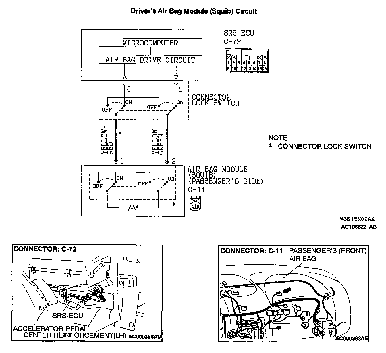 NOTE: *: The squib circuit connectors integrate a "short" bar (which prevents the air bag from deploying unintentionally due to static electricity by shorting the positive wire to the ground wire in the squib circuit when the connectors are disconnected). Therefore, if the connector C-11 or C-72 is damaged or improperly engaged, the short bar may not be released when the connector is connected.