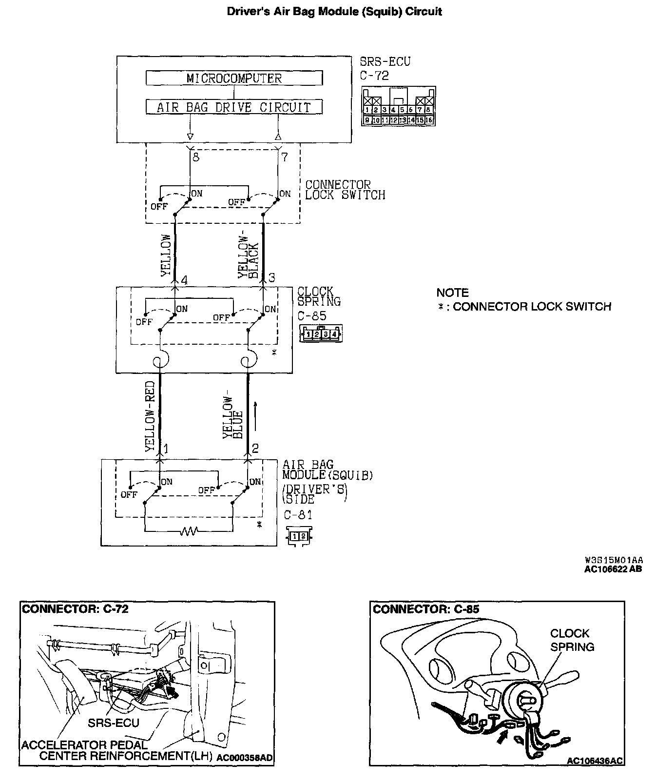 NO: Repair the harness wires between SRS-ECU connector C-72 and clock spring connector C-85. Then go to Step 5.