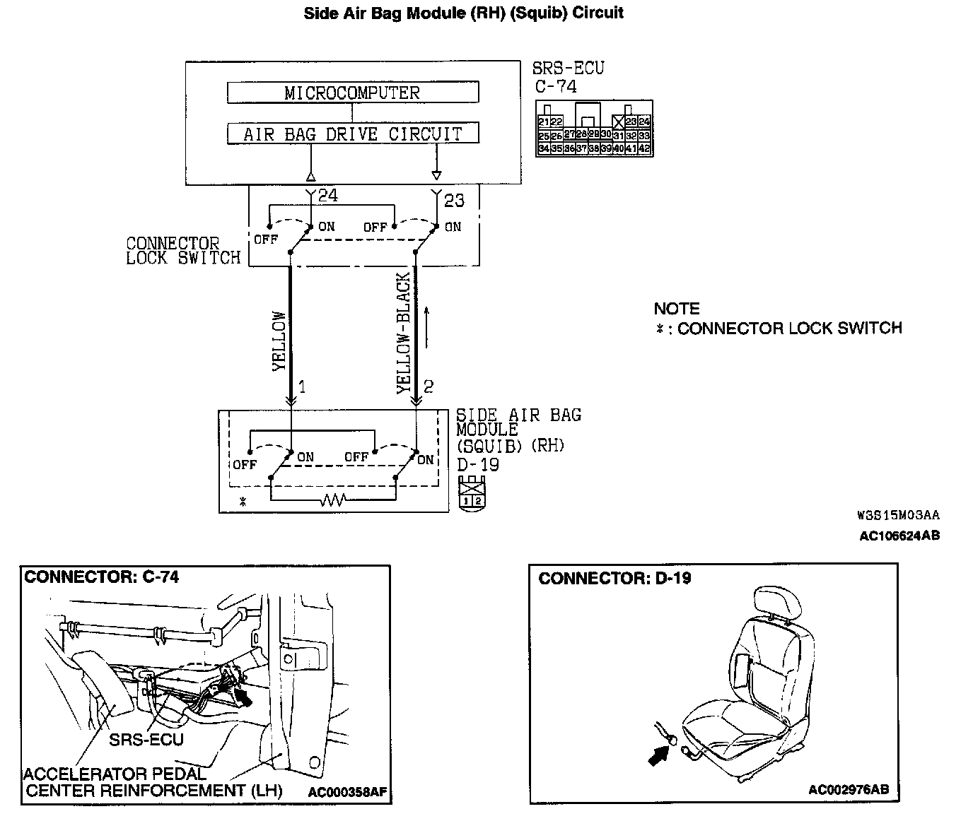 NO: Repair the harness wires between SRS-ECU connector C-74 and side-airbag module (RH) connector D-19. Then go to Step 3.
