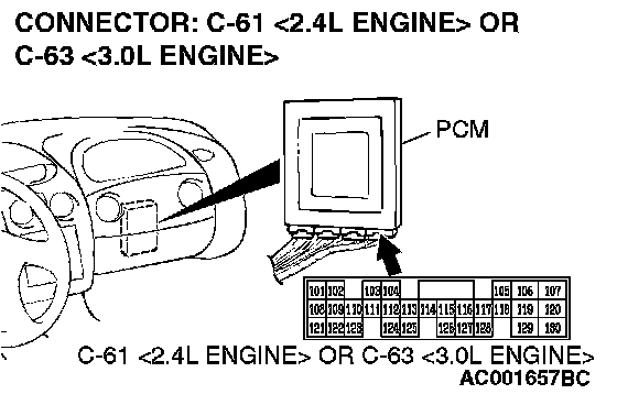 STEP 3. Check PCM connector C-61 <2.4L Engine> or C-63 <3.0L Engine> for loose, corroded or damaged terminals, or terminals pushed back in the connector.