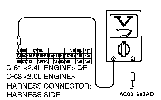 STEP 8. Measure the transmission range switch output voltage at PCM connector C-61 <2.4L Engine> or C-63 <3.0L Engine> by backprobing. ("R" position)