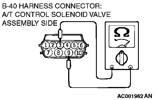 2) Measure the resistance between solenoid valve assembly connector B-40 terminals 3 and 9.
