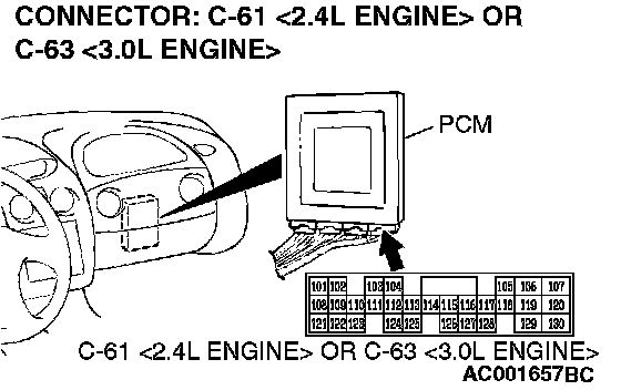 STEP 6. Check A/T control solenoid valve assembly connector B-40 and PCM connector C-61 <2.4L Engine> or C-63 <3.0L Engine> for loose, corroded or damaged terminals, or terminals pushed back in the connector.