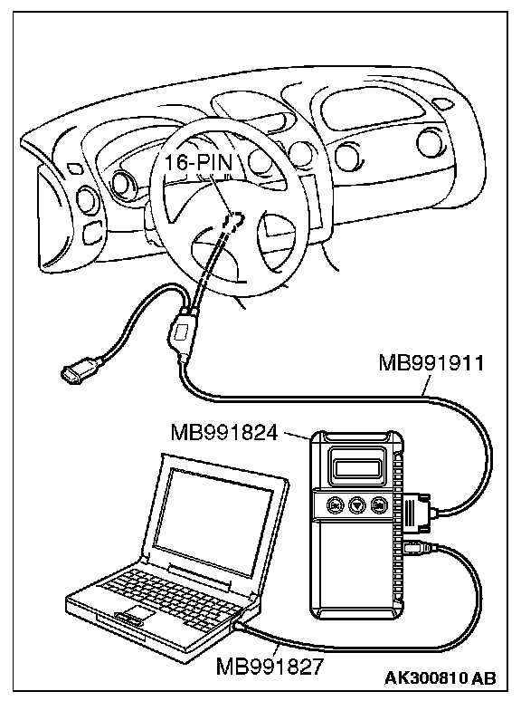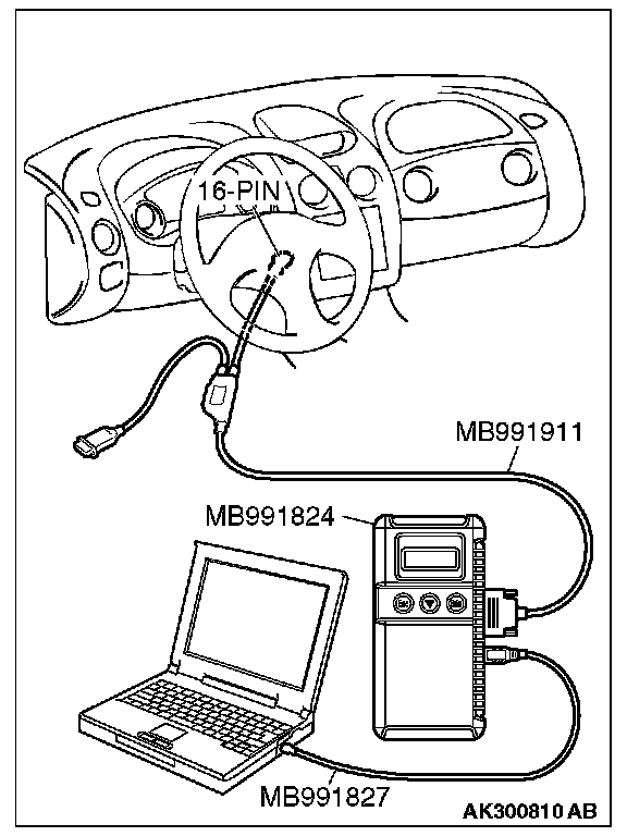 CAUTION: To prevent damage to scan tool MB991958, always turn the ignition switch to the "LOCK" (OFF) position before connecting or disconnecting scan tool MB991958.