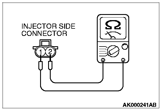 2. Measure the resistance between injector side connector terminal No. 1 and No. 2.
