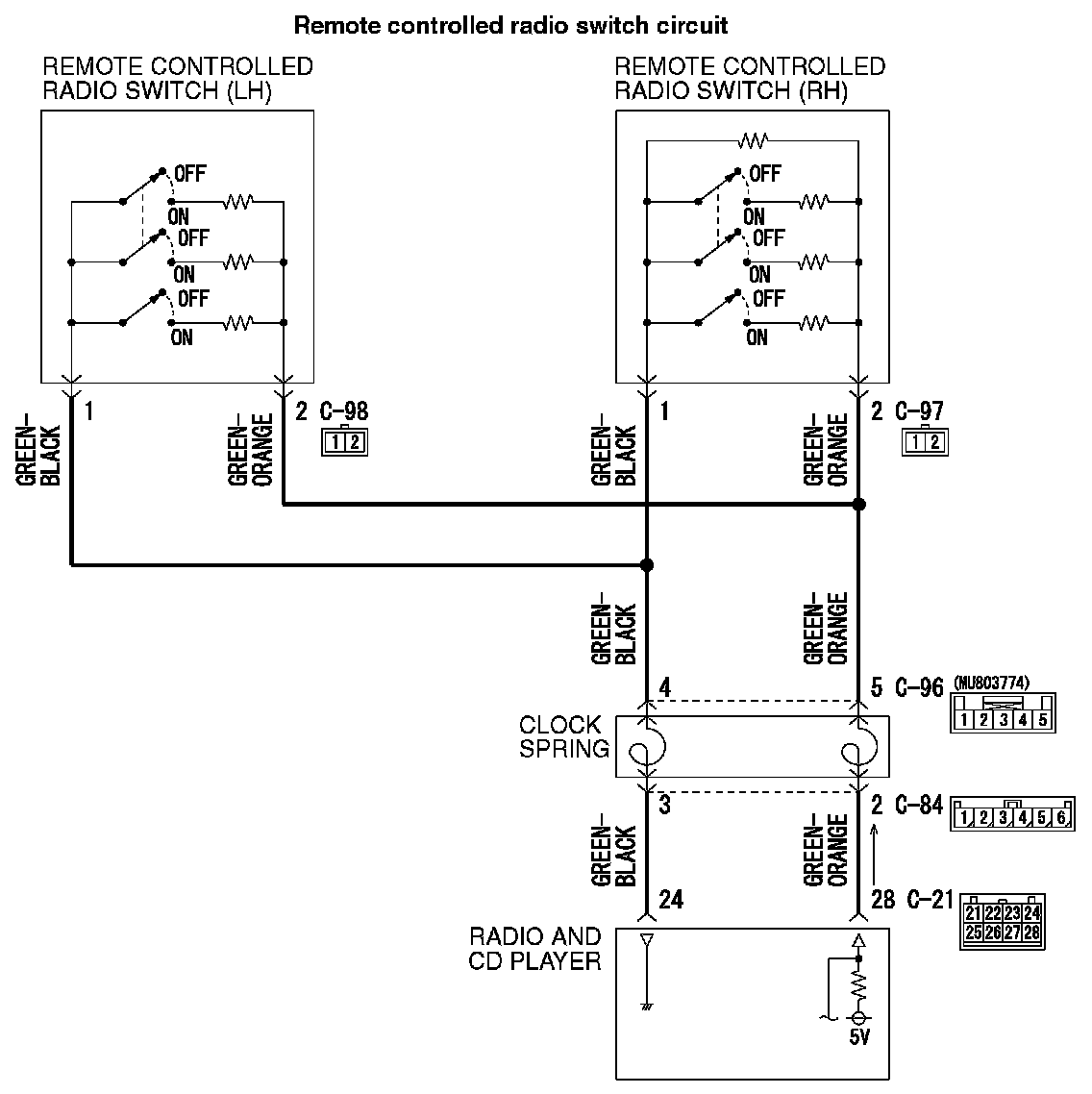 The system does not accept remote controlled radio switches (RH and LH), but accepts radio and CD player switches.Remote Controlled Radio Switch Circuit: