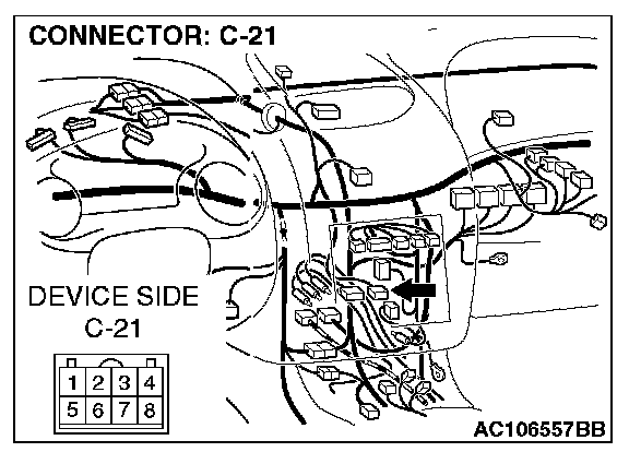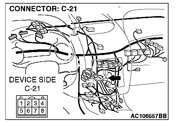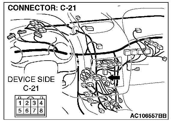 STEP 2. Radio and CD player connector C-21 and clock spring connector C-84 for damage.