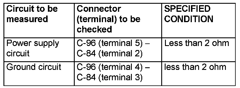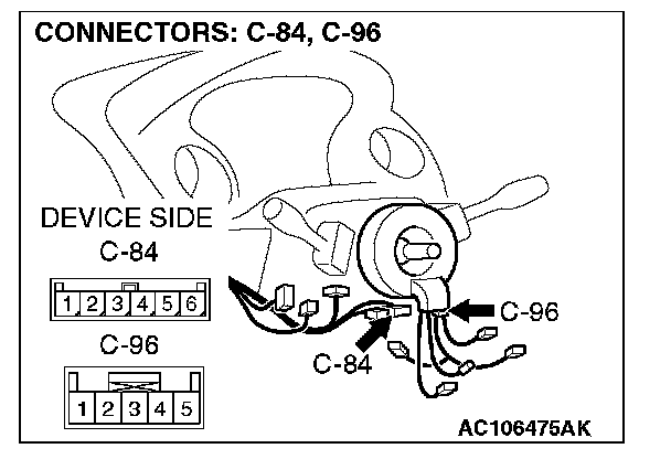 2. Measure the resistance at clock spring connectors C-96 and C-84.
