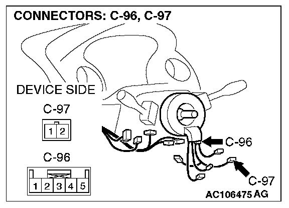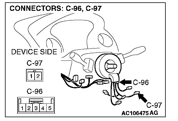 STEP 9. Check the wiring harness between clock spring connector C-96 (terminals 4 and 5) and switch (RH) connector C-97 (terminals 1 and 2).
