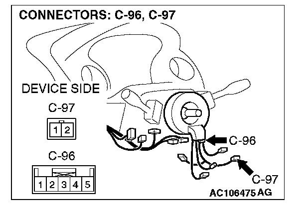 STEP 2. Check the switch (RH) connector C-97 and clock spring connector C-96 for damage.