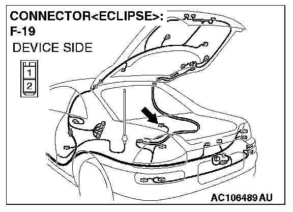 STEP 34. Check the wiring harness between rear speaker (RH) connector F-19 (terminal 1 and 2)