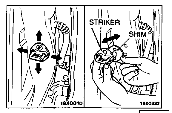 3. If the opening and closing of the door is stiff, adjust the linkage of the striker and the door latch with striker mounting shim, while moving the striker forward, backward or sideways.