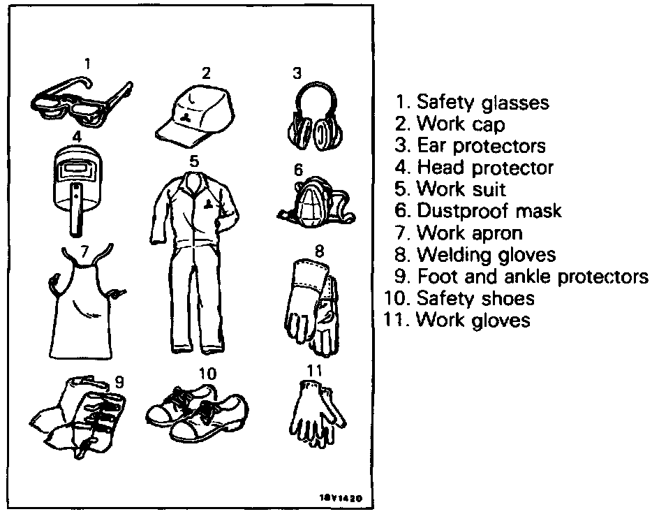 During body repair work, a work suit. a work cap, and safety shoes should be worn at all times Depending on the work being done, safety glasses. gloves. ear protectors, a dustproof mask, etc., should also be worn as needed.