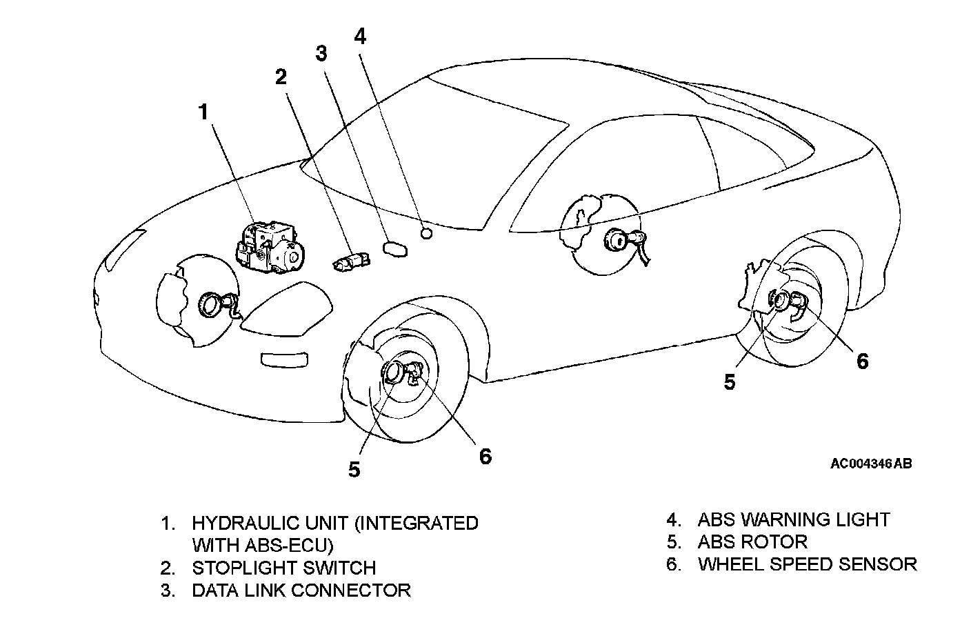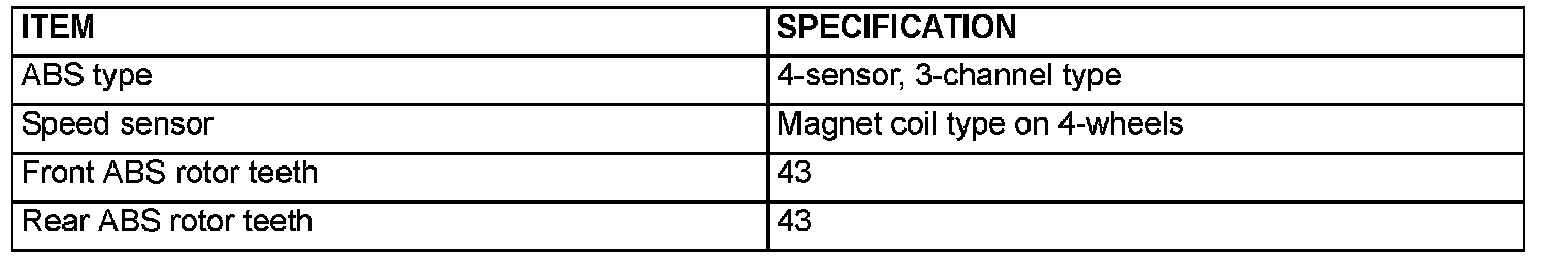 GENERAL DESCRIPTIONThe ABS consists of components such as the wheel speed sensors, stoplight switch, hydraulic unit assembly (integrated with ABS-ECU), ABS rotor, and the ABS warning light. If a problem occurs in the system, the malfunctioning components can be identified and the trouble symptoms will be memorized by the diagnostic function. In addition, reading of diagnostic trouble codes and data list and actuator testing are possible by using the Scan Tool.