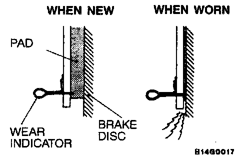 DISC BRAKE PAD CHECK AND REPLACEMENTNOTE: The brake pads have indicators that contact the brake disc when the brake pad thickness becomes 2 mm (0.08 inch), and emit a squealing sound to warn the driver.