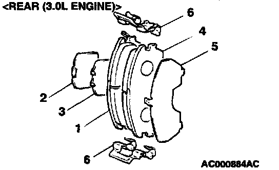 7. For front disc brake <2.4L ENGINE> and rear disc bake <3.0L ENGINE>, apply brake grease SAE J310, NLGI number 1 to the following positions before installing the pad.