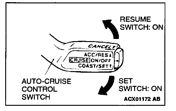 1. Turn the ignition switch to the "ON" position while holding the auto-cruise control switch in the "SET" position (down). Then, within one second, more the auto-cruise control switch up to the "RES" position.