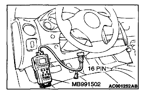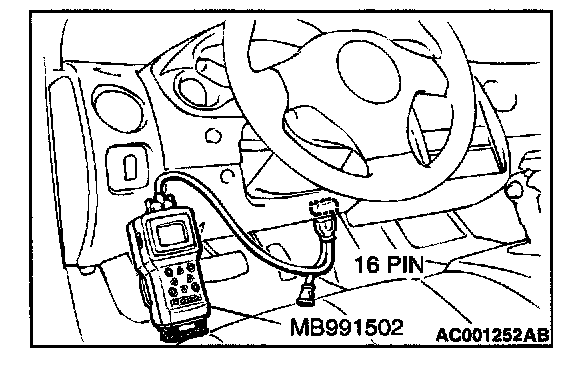 CAUTION: To prevent damage to scan tool MB991502, always turn the ignition switch to the "LOCK" (OFF) position before connecting or disconnecting scan tool MB991502.