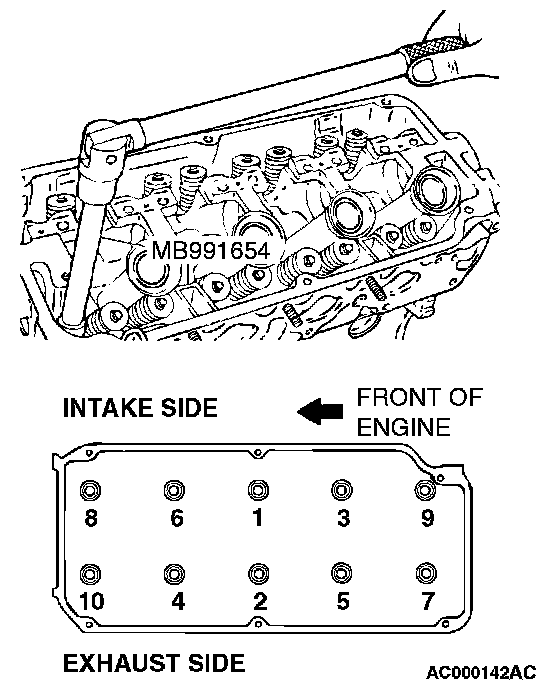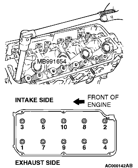 Using special tool MB991654, loosen the bolts in two or three steps in the order of the numbers shown in the illustration, then remove the cylinder head assembly.
