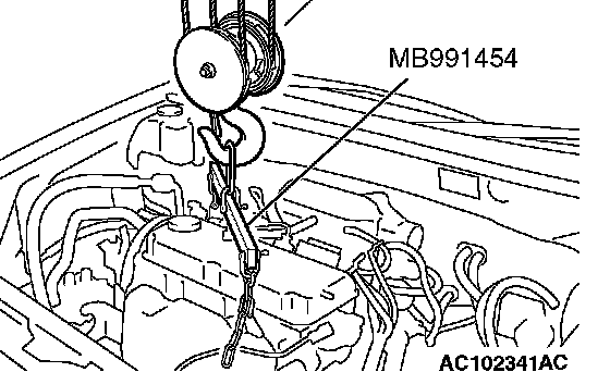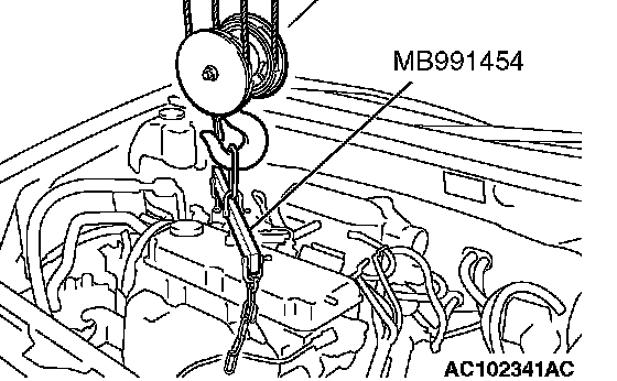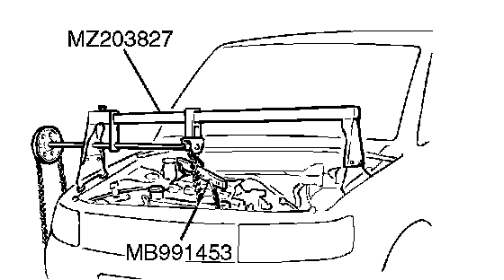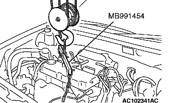 3. [Engine lifter MZ2073827 is used] Remove the chain block and support the engine assembly with special tools MB991453 and MZ203827.