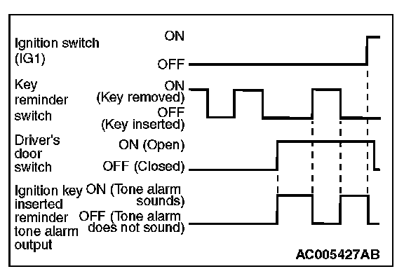 When the driver's door is opened with the ignition key inserted in the ignition key cylinder (ignition switch is in the OFF position,) the tone alarm sounds intermittently (horning sound) to indicate that the ignition key has not been removed.