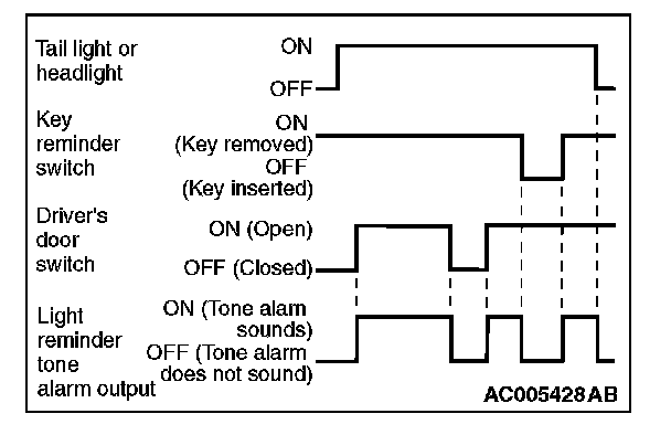 When the tail light or headlight is ON, if the ignition key is removed and the driver's door is opened, a tone alarm will sound continuously to warn that the light is illuminated. However, if the tail light or headlight has been turned off by the headlight automatic-shutdown function, the tone alarm will not sound.