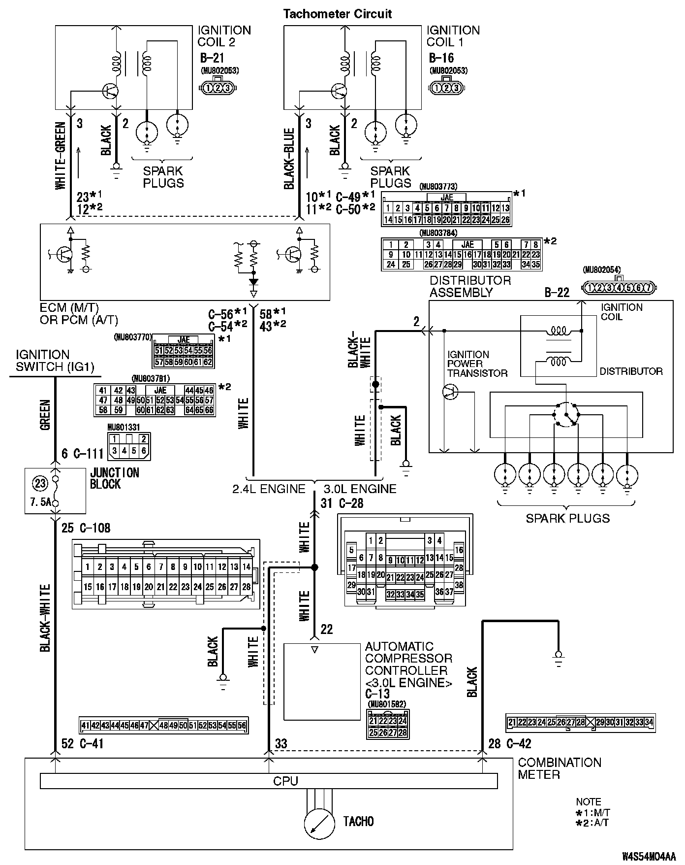 STEP 8. Check the wiring harness from combination meter connector C-42 (terminal 33) to ECM connector C-56 (terminal 58) <2.4L M/T> or PCM connector C-54 (terminal 43) <2.4L A/T>, distributor assembly connector B-22 (terminal 2) <3.0L engine> and automatic compressor controller connector C-13 (terminal 22) <3.0L engine>.
