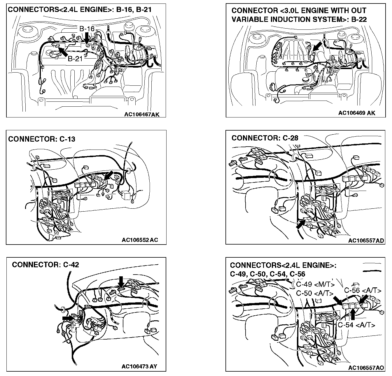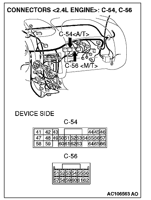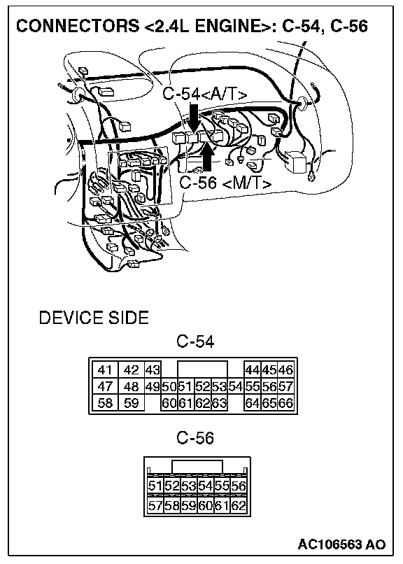 Q: Are ECM connector C-56 <2.4L M/T> or PCM connector C-54 <2.4L A/T>, distributor assembly connector B-22 <3.0L engine>, automatic compressor controller connector C-13 <3.0L engine> and combination meter connector C-42 in good condition?