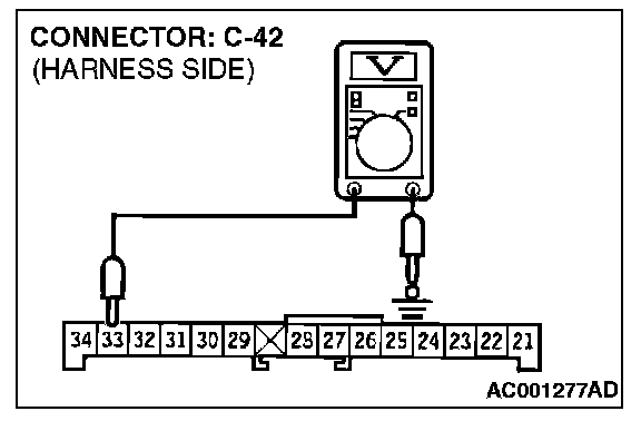 Q: Are the wiring harness from combination meter connector C-42 (terminal 33) to ECM connector C-56 (terminal 58) <2.4L M/T> or PCM connector C-54 (terminal 43) <2.4L A/T>, distributor assembly connector B-22 (terminal 2) <3.0L engine> and automatic compressor controller connector C-13 (terminal 22) <3.0L engine> in good condition?