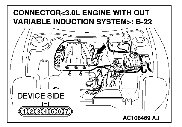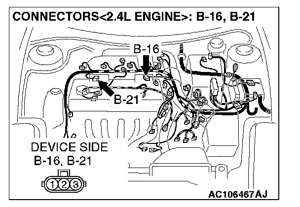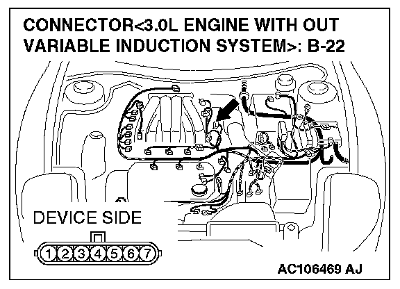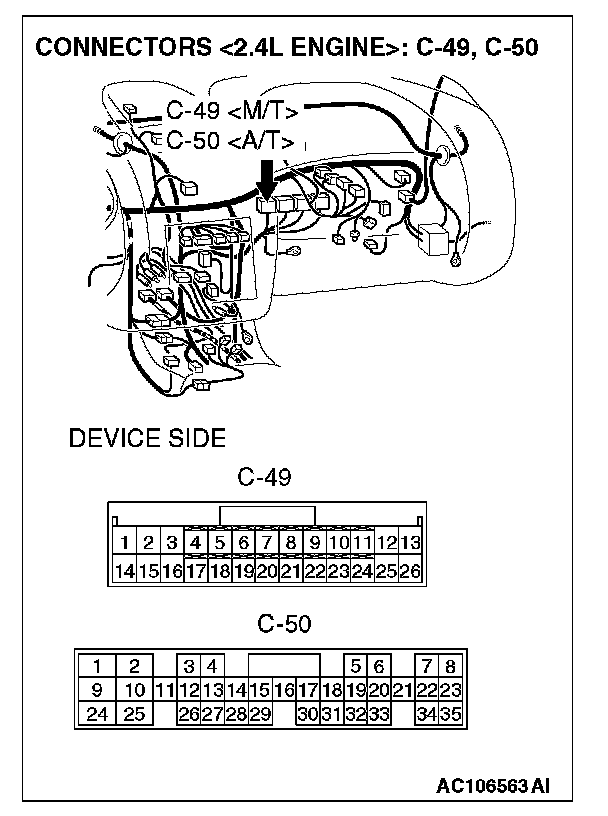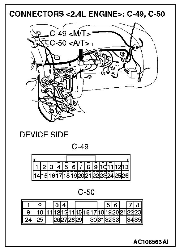 STEP 7. Check the ECM connector C-56 <2.4L M/T> or PCM connector C-54 <2.4L A/T>, distributor assembly connector B-22 <3.0L engine>, automatic compressor controller connector C-13 <3.0L engine> and combination meter connector C-42 for damage.