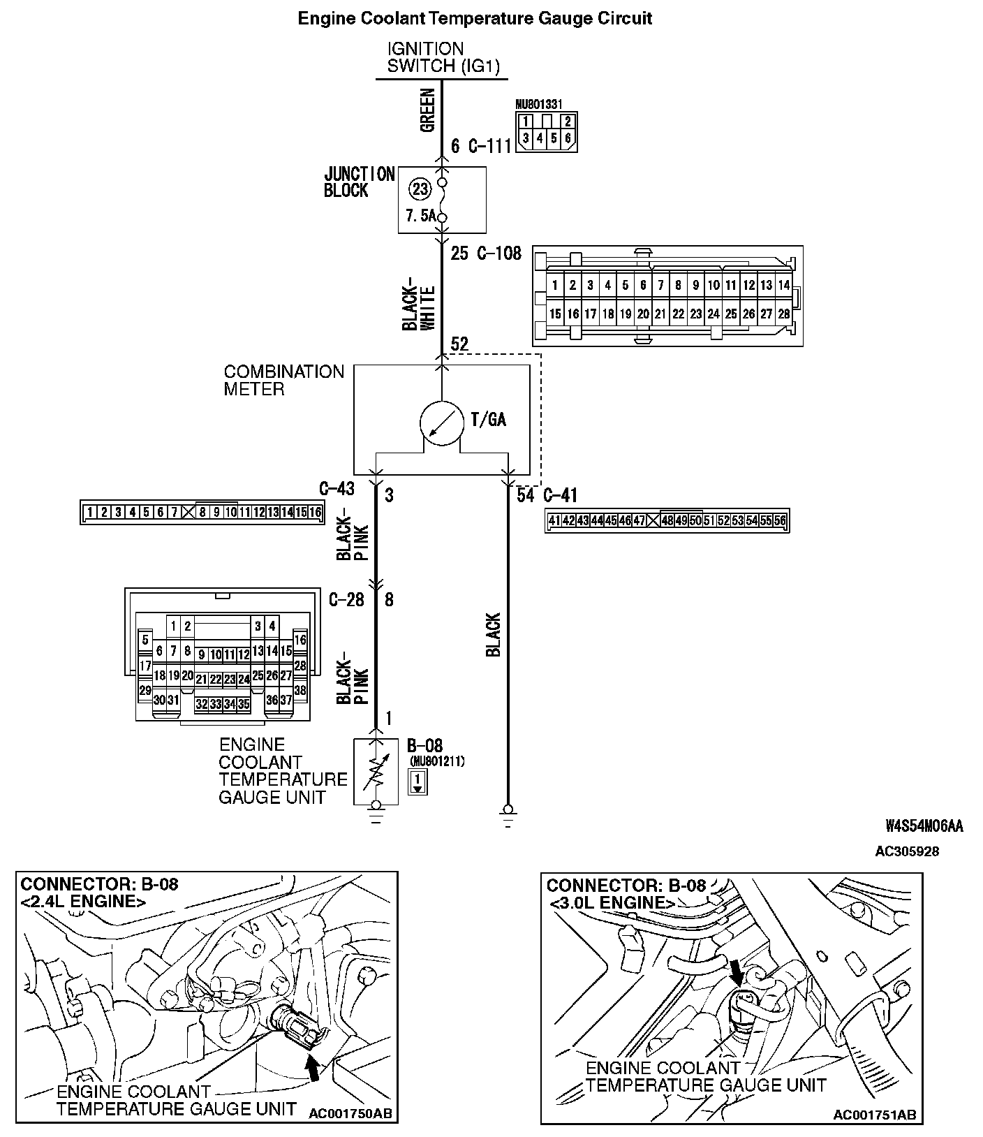 STEP 4. Check the wiring harness between engine coolant temperature sensor connector B-08 (terminal 1)and combination meter connector C-43 (terminal 3).